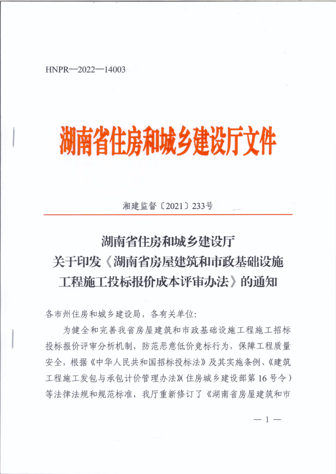 湖南省住房和城鄉(xiāng)建設廳關于印發(fā)《湖南省房屋建筑和市政基礎設施工程施工投標報價成本評審辦法》的通知